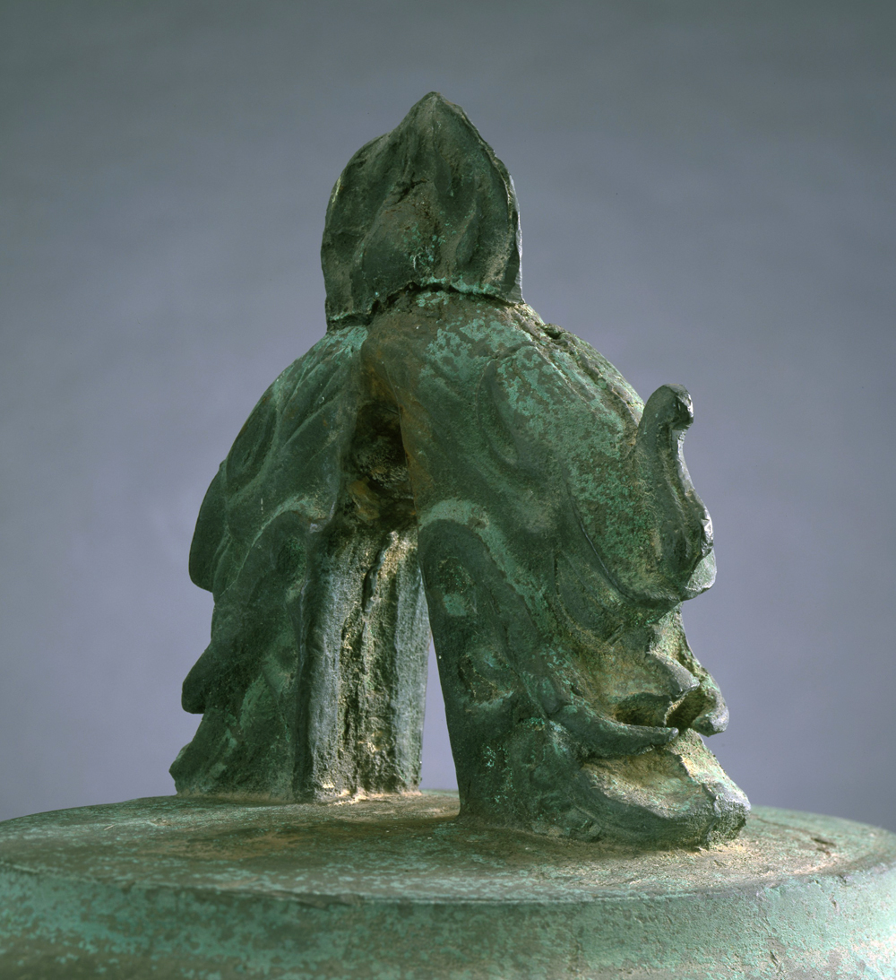 改めて梵鐘を見ていくと、口径に比べて丈が著しく高く、肩から下が口縁部にかけてほとんど直線で鐸状(裾開きの円筒状)をなした極めて狭長な形姿となり、装飾性を抑えた簡潔な造りの竜頭、簡素な八弁の蓮華形となる撞座など、他に類を見ないスタイリッシュな形をしています。