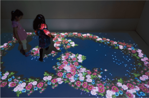 体験者の歩く動きに反応して足元に色とりどりの花が咲き、体験者の歩みに合わせて広がっていきます。偶然が生み出す瞬間の美しさを楽しみながら、自分だけの花の道を描ける作品です。
