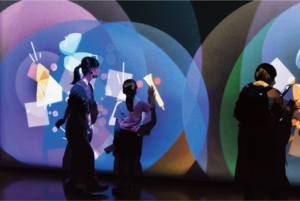 壁に手をかざすと、色々な楽器オブジェクトとともに音とアニメーションが生まれます。「合奏」や「重奏」をモチーフに、他の人とともに演奏する奏者の1人となって "ミル(見る)"合奏を体感するインタラクティブ作品です。